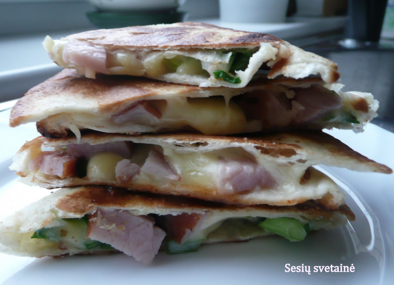 totilijų vidutinio dydžio kumpio, pjaustyto gabaliukais tarkuoto sūrio konservuoto jalapeno pjaustytų svogūnų laiškų sviestoPašildyti truputį tortiliją keptuvėje, kad pasidarytų minkštesnė. Dėti į ją kumpį, sūrį, jalapeną ir svogūnų laiškus. Sulenkti pusiau. Ištirpdyti keptuvėje sviestą ir apkepti tortiliją iš abiejų pusių, kol apskrus.